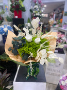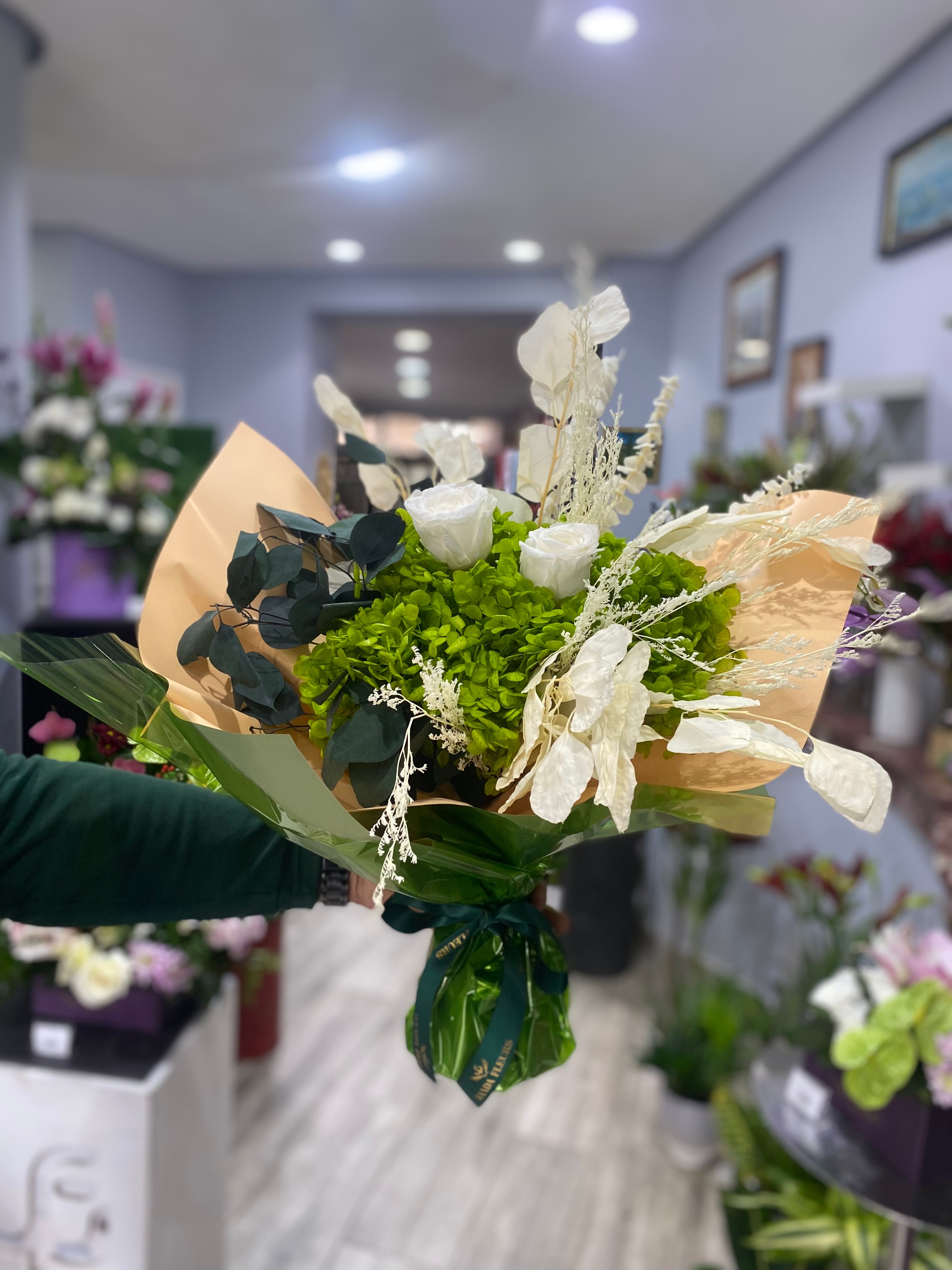 Bouquet de fleurs naturelle eternelle vert et blanc